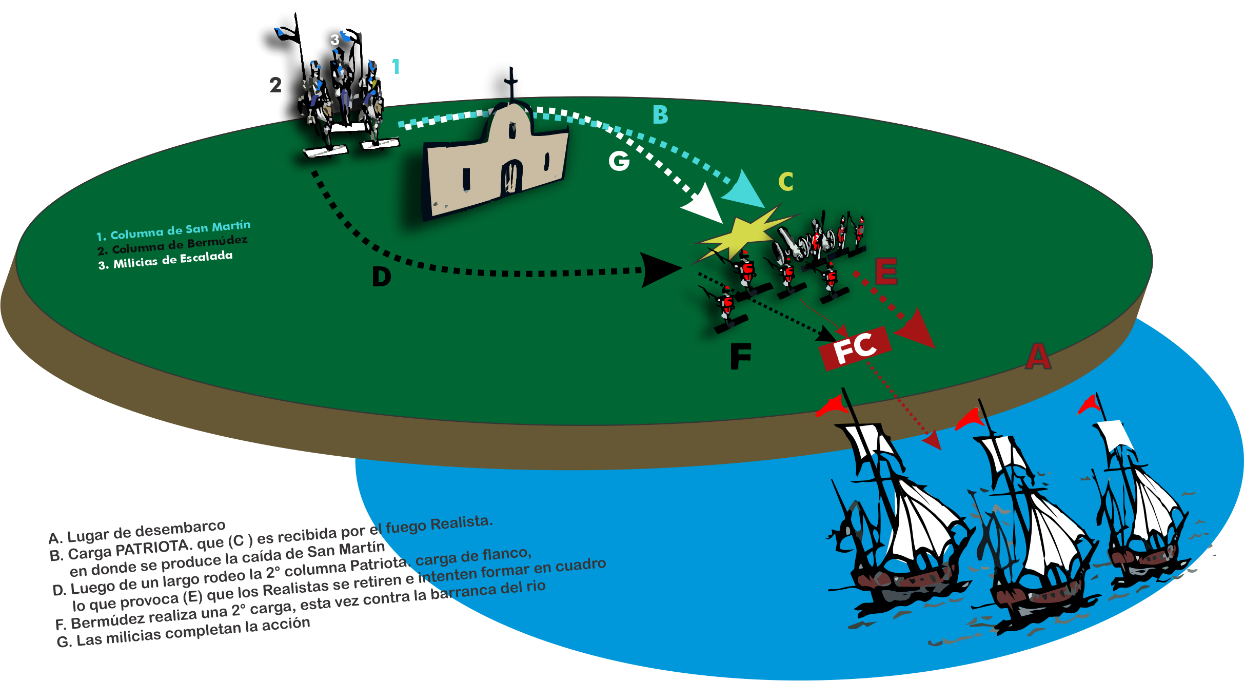 El GRANADERO BAIGORRIA lancea a un soldado real que intentaba herir a San Martín. El soldado correntino, JUAN BAUTISTA CABRAL echó pie a tierra y levantó el caballo permitiendo a su jefe reincorporarse. Entonces fue herido de muerte. Cabral sabía que salvando a su jefe, salvaba a la Patria. Son sus manos la fuerza ingobernable del que solo tiene por ganar su libertad. Los españoles no pudieron hacer más que replegarse y arrojarse desde la barranca en busca de sus barcos. La victoria patriota fue contundente. Había escarmentado el enemigo. Matar o morir por la Patria, ese fue el juramento. El río fue testigo de que lo cumplieron.