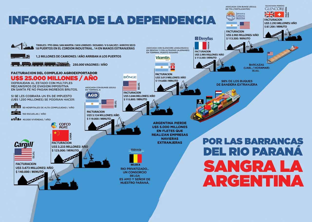 En las condiciones actuales Argentina es un país dependiente, que está sometida a las potencias extranjeras, con una parte del territorio y espacio marítimo ocupado por los invasores ingleses, pagando una deuda fraudulenta e ilegítima, y sin control sobre las riquezas que se producen en este suelo.Otro país es posible si rompemos con esas cadenas de la dependencia. Recuperar la Vía Navegable Troncal del Paraná es romper un eslabón de esa cadena.